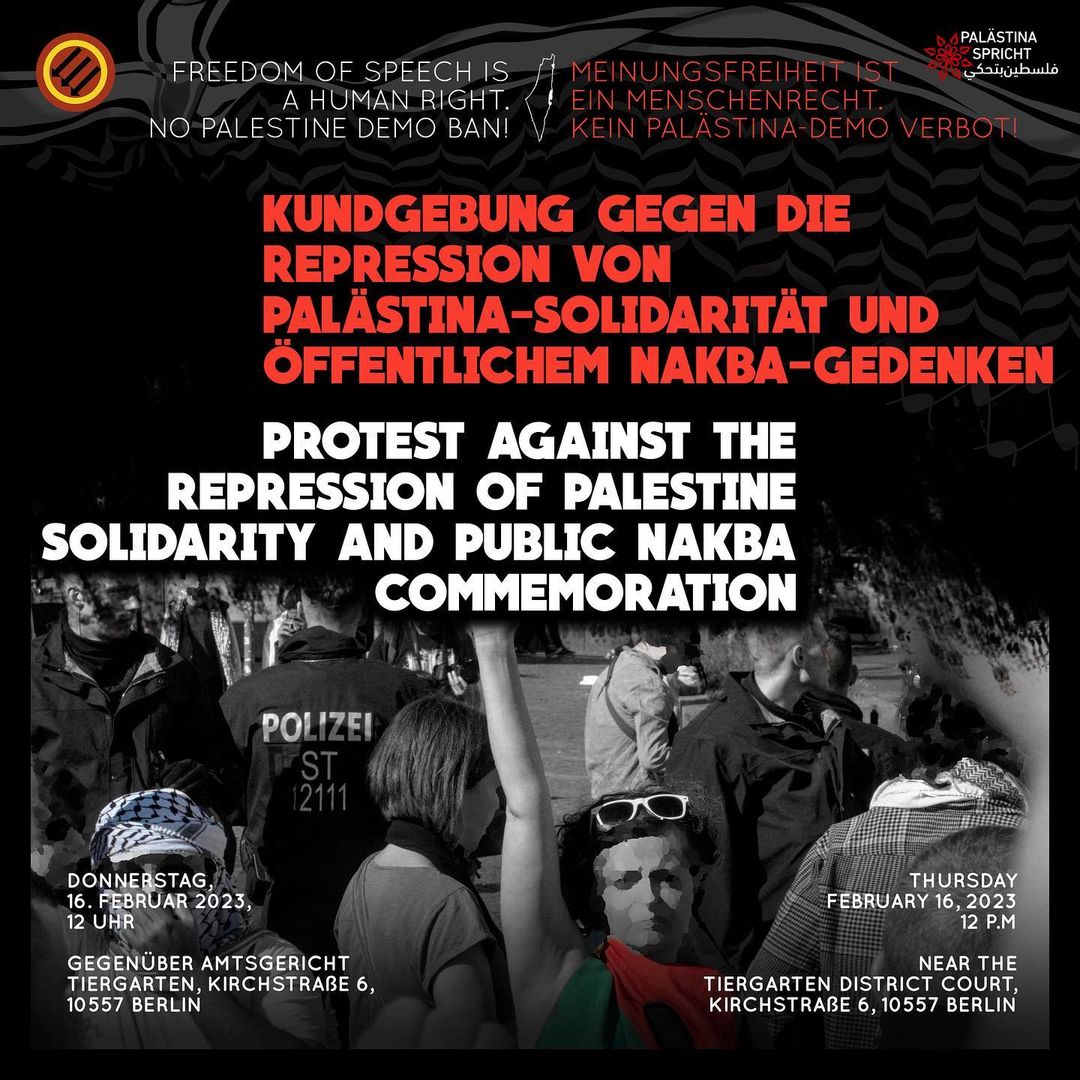 Am 16. Februar findet ein Gerichtsverfahren gegen einen der 27 Aktivist*innen statt, die zum 74. Nakba-Gedenktag im letzten Jahr unrechtmäßig von der Polizei auf dem Hermannplatz festgehalten wurden. Diese Einschränkung der freien Meinungsäußerung und der Versammlungsfreiheit lassen wir uns nicht widerstandslos gefallen. Mit einer Kundgebung vor dem Amtsgericht Tiergarten demonstrieren wir gegen diesen weiteren Versuch, Palästinenser*innen und mit ihnen solidarische Stimmen zum Schweigen zu bringen.