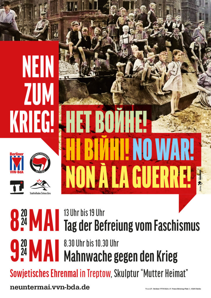 Wir Antifaschist*innen gehen auch in diesem Jahr am 8. und 9. Mai zum Sowjetischen Ehrenmal in Treptow, um die gefallenen Befreier*innen der Roten Armee zu ehren, aber auch um klar und deutlich zu sagen: Es ist entsetzlich, dass die Enkel der Opfer des deutschen Faschismus, die Enkel unserer Befreier*innen in Russland und der Ukraine aufeinander schießen müssen.