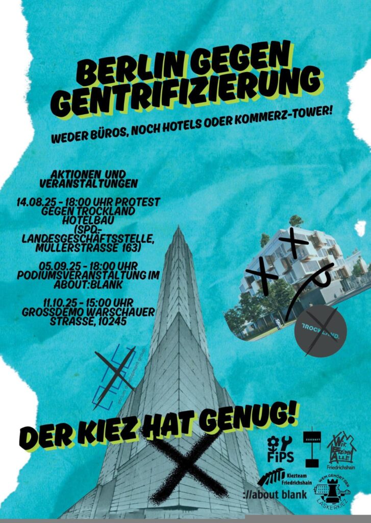 Wir können uns diese städtebaulichen Fehlentwicklungen nicht länger leisten und rufen zu Aktionen, sowie einer gemeinsamen Demonstration am 11. Oktober 2025 in Friedrichshain auf!