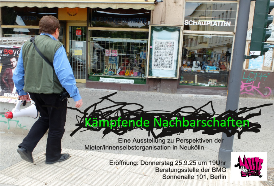 Dieser Geschichte widmet sich die von der BMG-Bezirksgruppe Neukölln kuratierte Ausstellung, die von Aktiven verschiedener Initiativen zusammengestellt wurde. Sie stellt Perspektiven von Selbstorganisation gegen die kapitalistische Stadt in den Mittelpunkt, veranschaulicht die Vielfalt politischer Praxen und soll Mut machen, sich zusammenzuschließen und Teil der widerspenstigen Stadt zu werden.