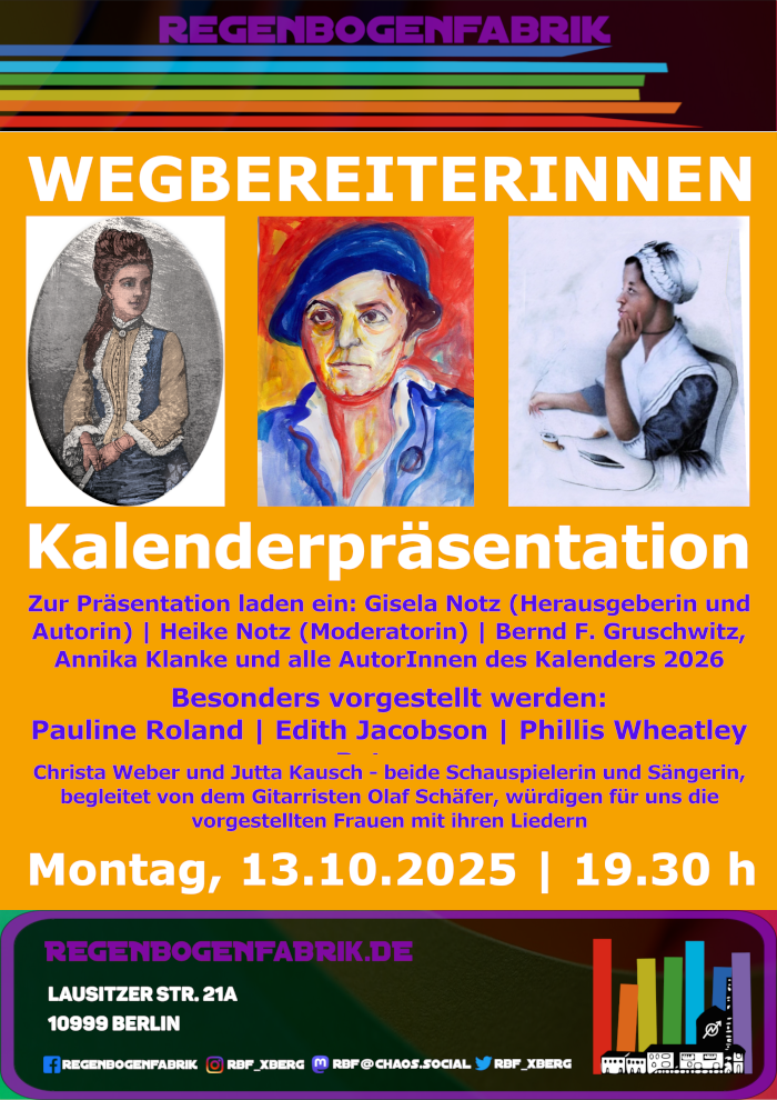 Im Jahr 2026 erscheint der Wandkalender „Wegbereiterinnen“ in der 24. Ausgabe. Seit er 2003 zum ersten Mal erschienen ist, haben wir 288 Frauenbiografien angesammelt. Mehr als 100 HistorikerInnen, PolitikwissenschaftlerInnen, NaturwissenschaftlerInnen, HandwerkerInnen, LehrerInnen und viele andere haben in den Kalendern geschrieben. Auch 2026 werden wieder zwölf berühmte, bekannte oder zu Unrecht vergessene Frauen aus der emanzipatorischen internationalen Frauenbewegung vorgestellt.