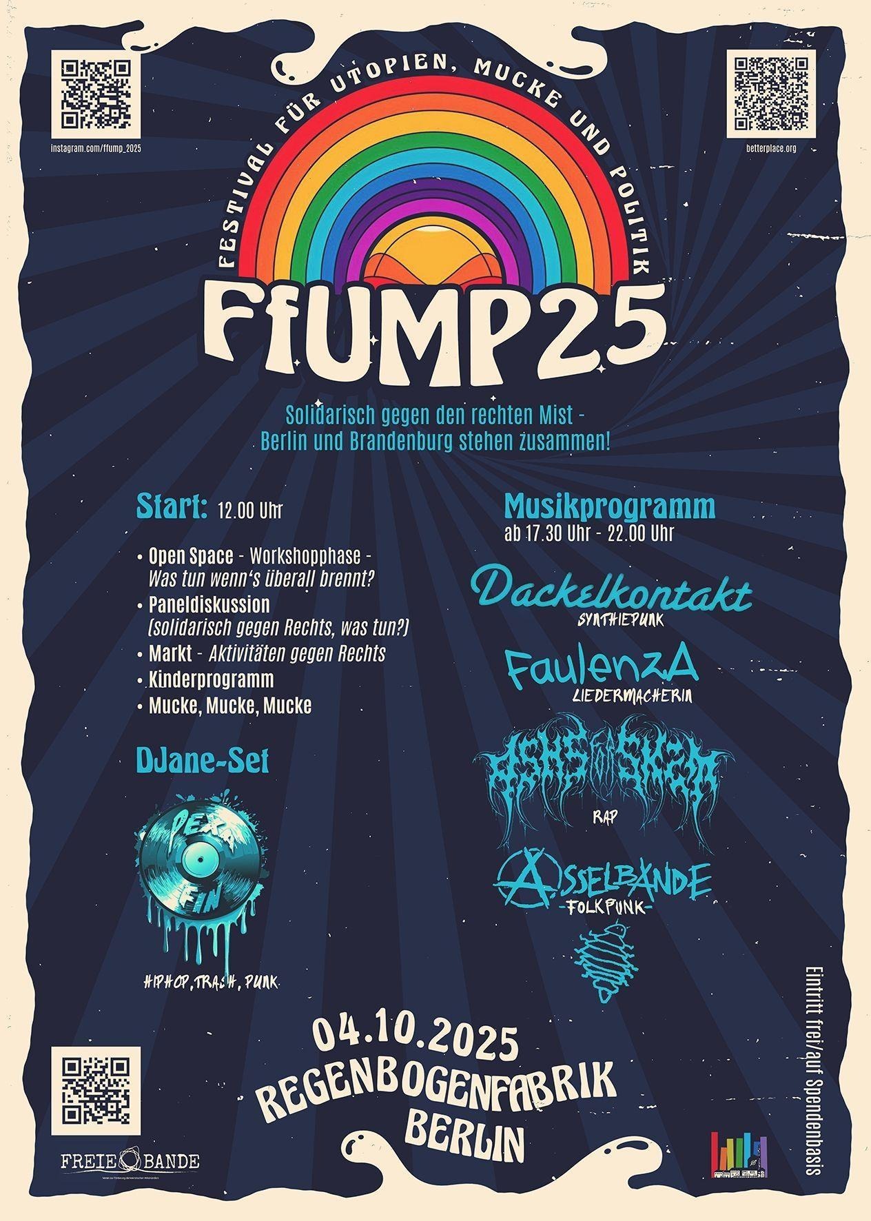 Bald ist es soweit, das Festival für Utopien, Mucke und Politik (FfUMP25) findet am 04.10.2025 in der Regenbogenfabrik in Berlin-Kreuzberg zum ersten Mal statt. Es erwartet euch ein Tag gespickt mit einem umfangreichen Programm – von einem moderierten Panel über Vernetzungsmöglichkeiten, sowie lockerem Austausch zu Unterstützungsbedarfen von Initiativen und Gruppen aus Brandenburg und Berlin und natürlich jeder Menge Musik. Hier haben wir einige FLINTA* Bands aus Brandenburg und Berlin gewinnen können. Das musikalische Spektrum reicht von Rap bis Indie sowie einem DJ Set zum Abschluss der Veranstaltung.