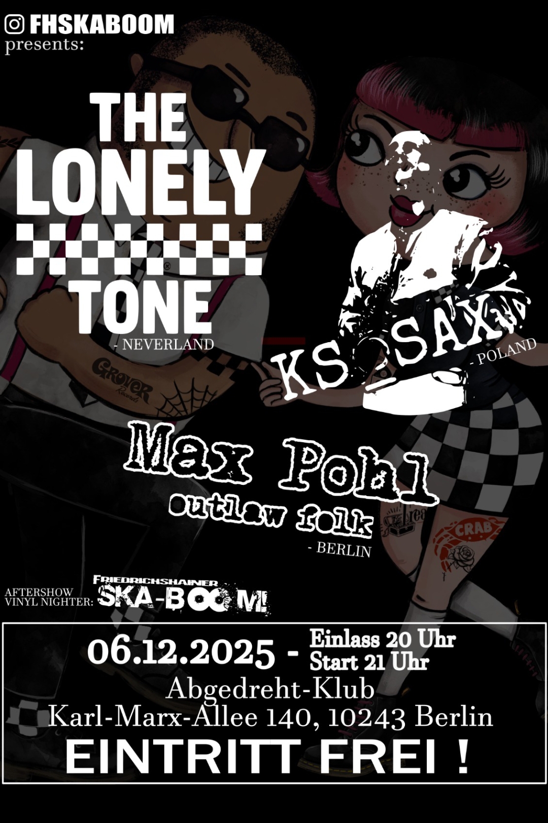 Samstag, 6. Dezember 2025, 20:00 Kneipe/Café Musik/Konzert The lonley Tone, KS_Sax und Max Pohl, DJ Friedrichshainer skaboom) Newcomer stellen sich vor. Bild Ort Abgedreht-Klub Karl-Marx-Allee.140 10243 Berlin Deutschland