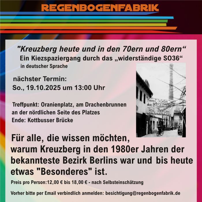 Andy, waschechter Kreuzberger, „ü60“ und seit 20 Jahren im Regenbogenfabrik-Kollektiv, wird euch durch SO36 führen und versuchen, euch „das Gefühl und das Leben damals“ nahe zu bringen.