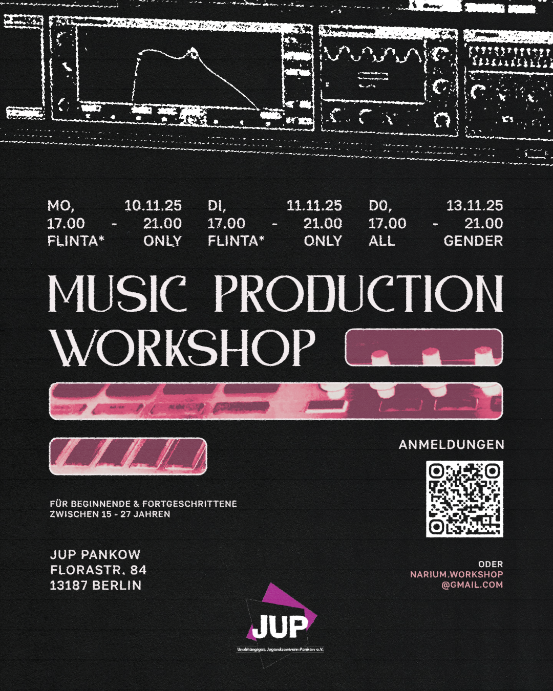Musik produzieren für Beginnende und Fortgeschrittene! Im November finden wieder drei der beliebten Workshops im JUP statt. Zwei mal für FLINTA* only, einmal für all gender. Immer für Menschen zwischen 14 und 27 Jahren. Melde dich schnell an via QR Code per Mail an: narium.workshop@gmail.com