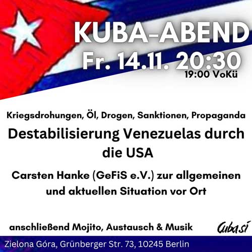 Hierzu lädt Cuba sí alle Interessierten herzlich zum Themenabend mit Carsten Hanke (GeFiS e.V.) ein. Hanke berichtet über die allgemeine und aktuelle Situation vor Ort.