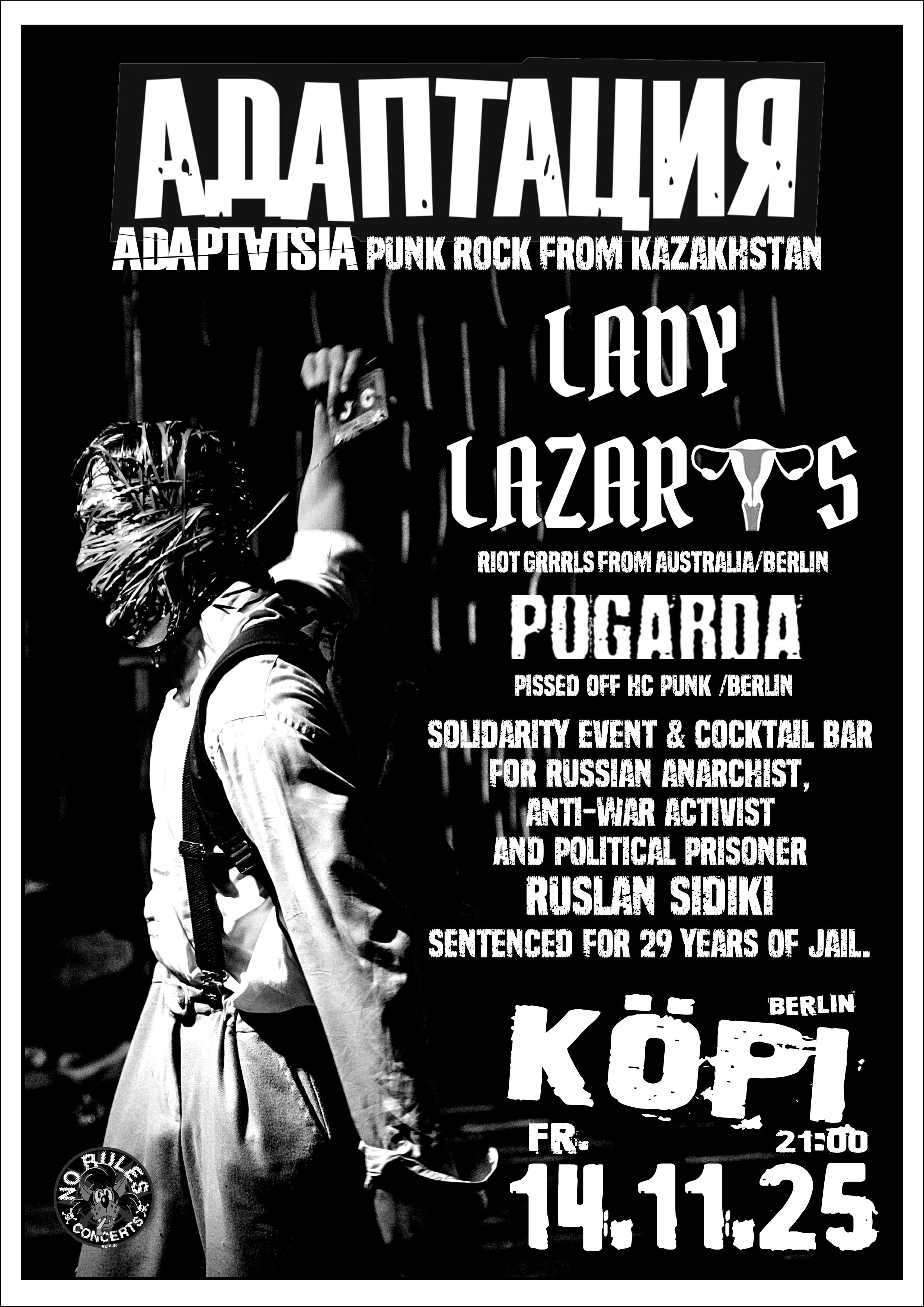 Freitag, 14. November 2025, 21:00 Musik/Konzert "Адаптация" (Adaptatsiya, Punk Rock, Kazakhstan) - "Lady Lazarus" (Riot Grrrrl, Sydney/Berlin) - "Pogarda" (Pissed Off Hardcore Punk, Berlin) Bild KØPI Ort KØPI Köpenicker Straße 137 10179 Berlin Deutschland