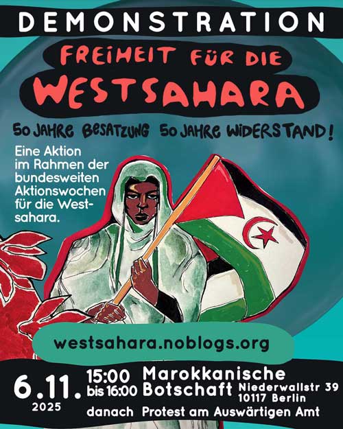 Bundesweite Aktionswochen Westsahara 31.10.–14.11.2025: https://westsahara.noblogs.org