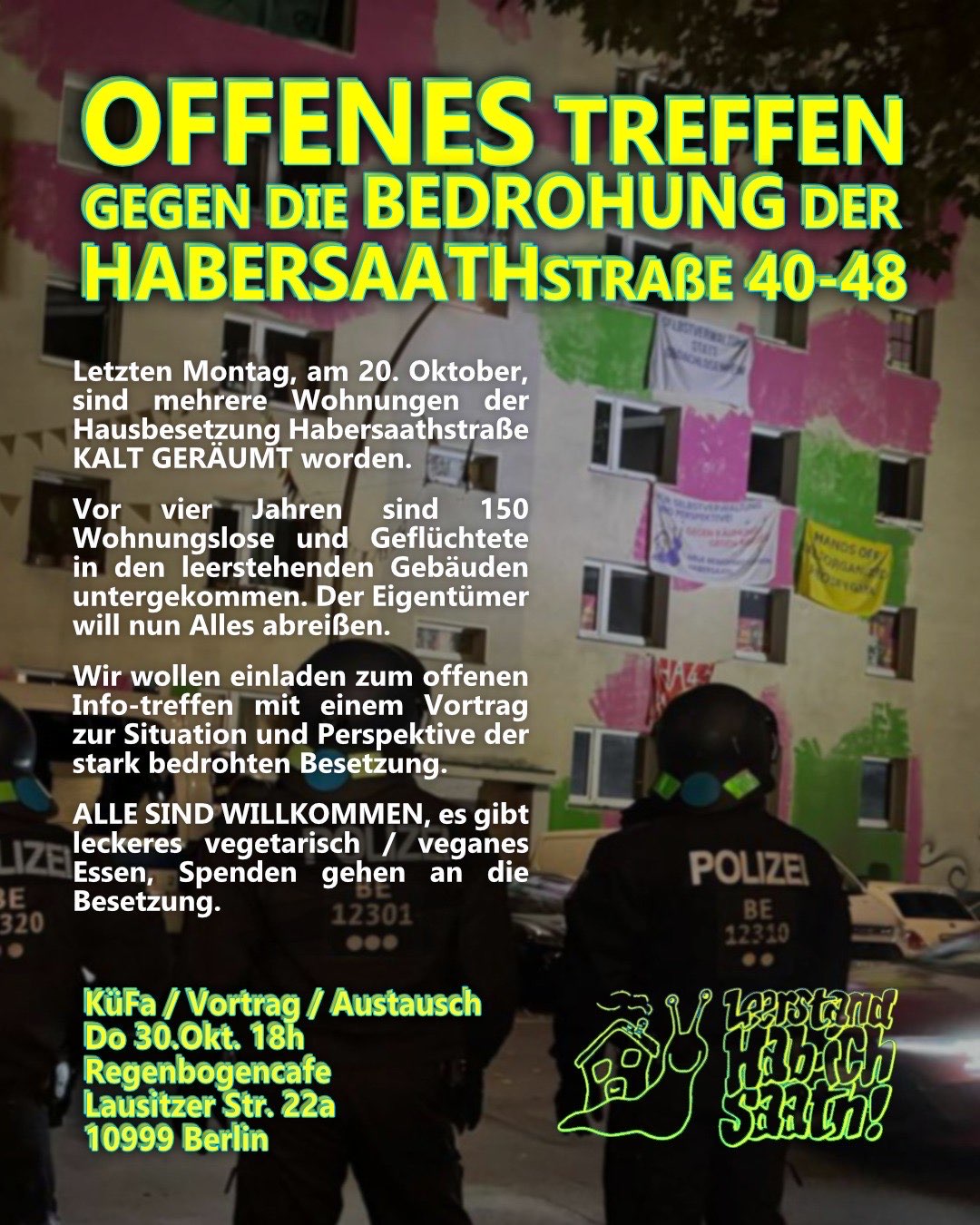 Letzten Montag, am 20. Oktober, sind mehrere Wohnungen der Hausbesetzung Habersaathstraße KALT GERÄUMT worden.