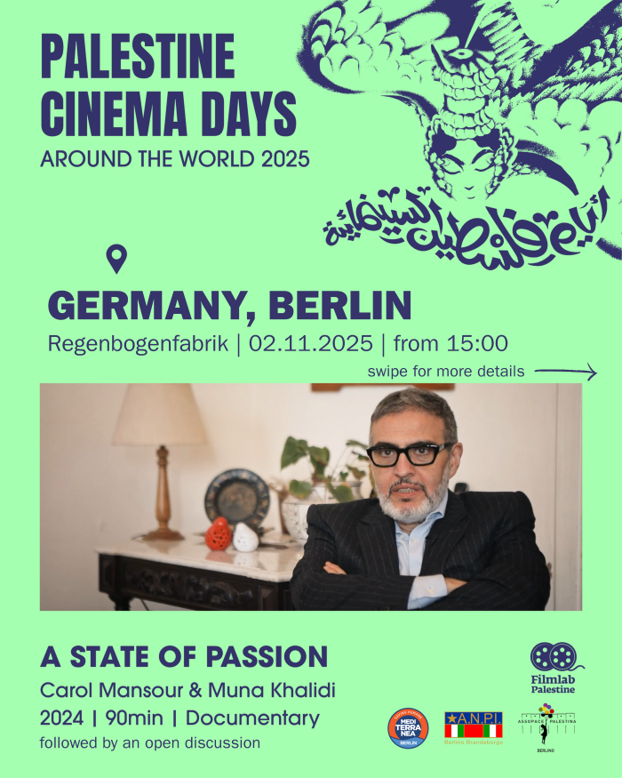 Mediterranea Berlin e.V., Anpi Berlin Brandenburg und Assopace Palestina Berlin nehmen an den “Palestine Cinema Days Around the World 2025” teil und organisieren die Vorführung des Dokumentarfilms „A State of Passion“ (Carol Mansour & Muna Khalidi, Dokumentarfilm, 90 Min., 2024) im Kino der Regenbogenfabrik.