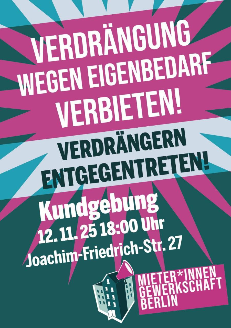 Die Mieter*innengerwerkschaft Berlin vertritt die klare Position: Eigenbedarfskündigungen sind nicht akzeptabel, nicht gerechtfertigt und nicht notwendig – die Mieter*innen selbst haben den Bedarf an ihrem Wohnraum.