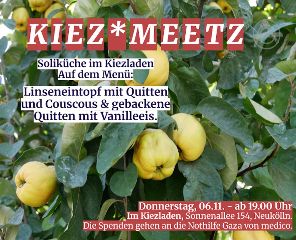 06.11. // من الساعة 7 مساءً // @ KIEZLADEN Sonnenallee 154يخنة العدس مع السفرجل والكسكس & سفرجل مخبوز مع بوظة الفانيلياندعم من خلال عائدات التبرعات برنامج الإغاثة الطارئة لغزة التابع لمنظمة medico international، وهي منظمة عالمية للإغاثة وحقوق الإنسان. للمزيد من المعلومات: