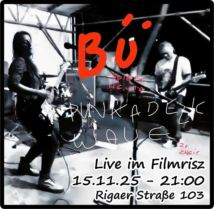 Samstag, 15. November 2025, 20:30 Kneipe/Café Musik/Konzert Wir haben Bü - Punkadelic Wave zu zweit - live im Filmrisz ab 20:30! Bild Filmrisz Ort Filmrisz Filmrisz Rigaerstr. 103 10247 Berlin Deutschland U Frankfurter Tor