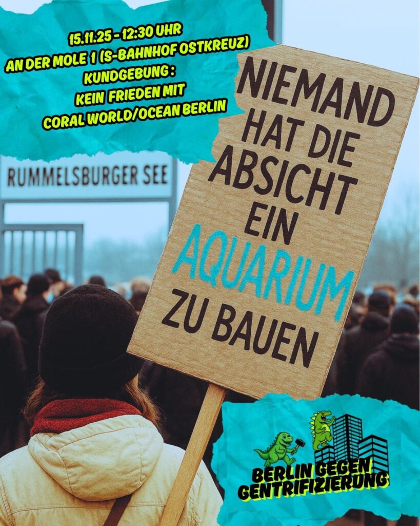 Am 15.11.2025 laden die Investoren des Riesenaquariums „Ocean Berlin“ des Unternehmens Coral World ab 13 Uhr zu einer Baustellenbesichtigung ein. Diesen Termin wollen Anwohner*innen und Stadtteilinitiativen nutzen, um mit einer Kundgebung ab 12.30 Uhr noch einmal unseren Protest gegen dieses Hotel mit Riesenaquarium auszudrücken. Hinter Coral-World steht ein internationales Konsortium von Investoren, die in angesagten Orten rund um die Welt solch hochpreisige Tourismusprojekte errichten, von denen die einheimische Bevölkerung nicht profitiert. In der Gegend rund um das Ostkreuz erhöht Coral World Verdrängungsdruck und Gentrifizierung weiter.