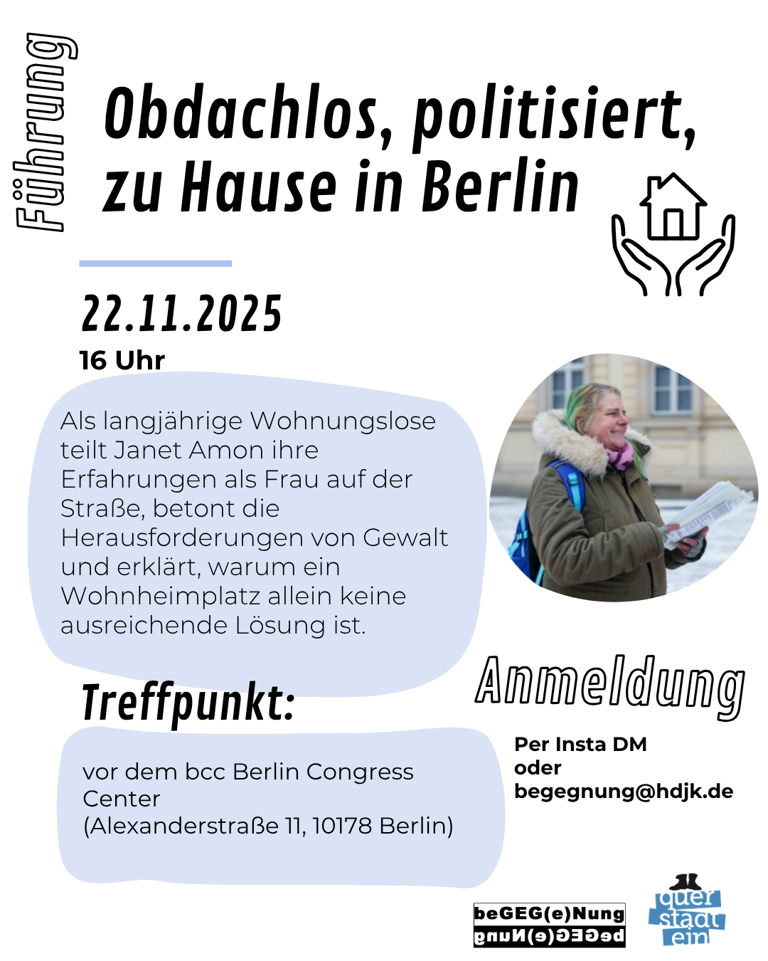In Zusammenarbeit mit Querstadtein laden wir euch zu einer Führung am Alexanderplatz ein. Janet wird über ihre Erfahrungen als ehemals obdachlose Person erzählen und wie es ist, auf der Straße politisch zu sein. Die Führung ist kostenlos, bitte meldet euch unter begegnung@hdjk.de an.