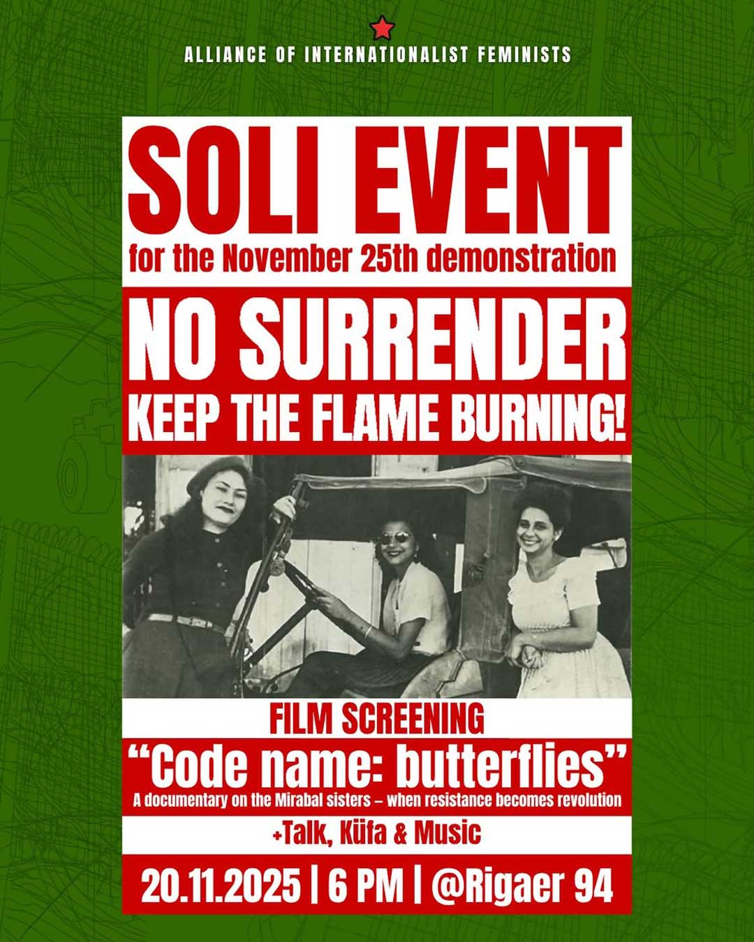 We will screen „Codename: Butterflies“ to honor all comrades who continue resisting from prisons, exile, and occupied territories. The same systems that targeted the Mirabal Sisters, including imperialism, Zionism, capitalism, patriarchy, and the prison industrial complex, remain global tools of repression. And still, our movements do not surrender.