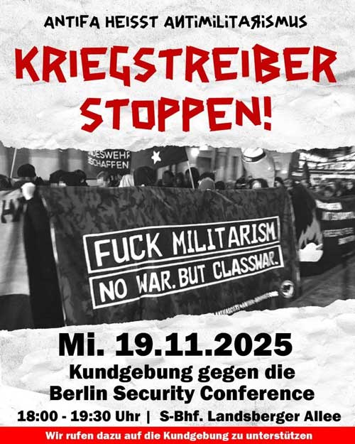 Antifa heißt Antimilitarismus - Kriegstreiber stoppen! // Als „Kein Vergeben. Kein Vergessen.“ Bündnis haben wir bereits in unserem Aufruf zur antifaschistischen Demo am 22. November in Lichtenberg die Berlin Security Conference (BSC) und die Behördenspiegel-Gruppe als dessen Veranstalter*in thematisiert. Wir begrüßen die Aktion antimilitaristischer und palästinasolidarischer Gruppen gegen die Kriegskonferenz in unseren Kiezen. Wir rufen darum zur Beteiligung an der Kundgebung gegen die BSC.