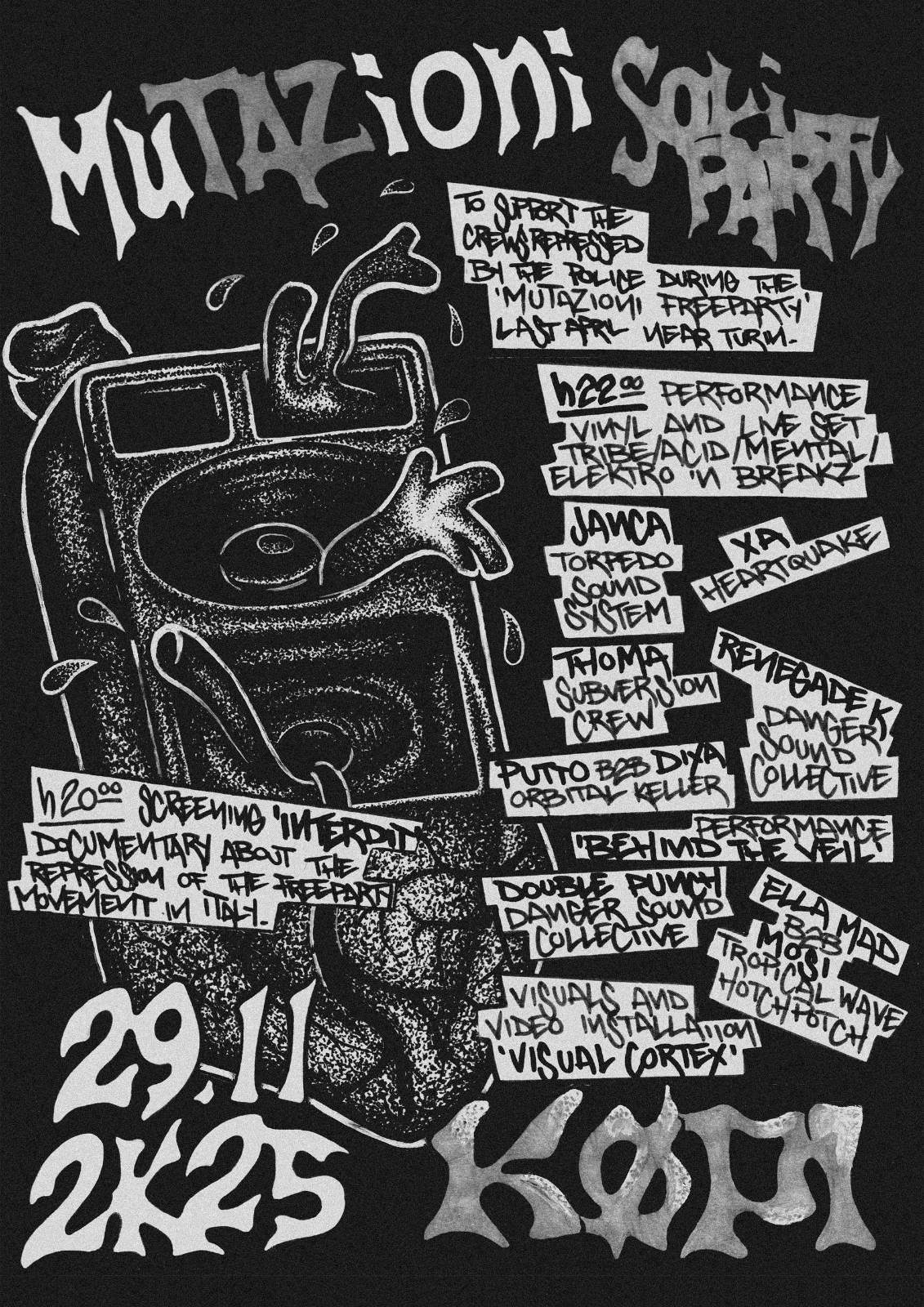 Soliparty to support the crews repressed by the police during the "MuTaZioni freeparty" last April near Turin.
