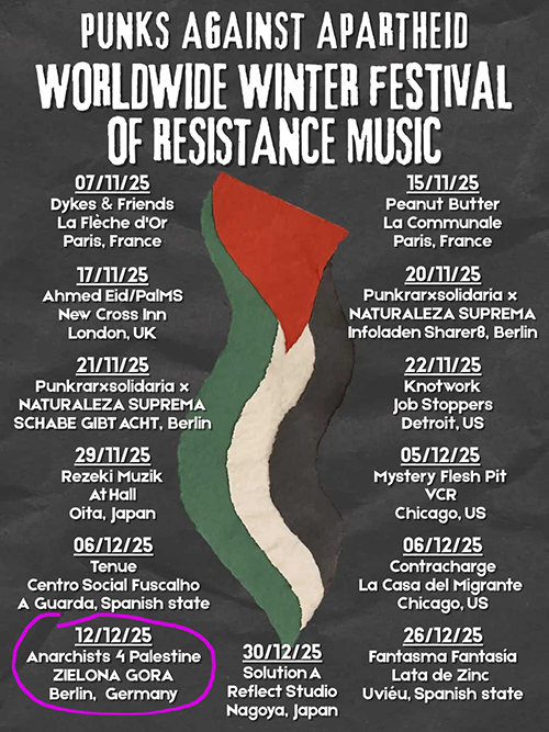 A night of loud music, solidarity and resistance! This is a benefit event supporting projects backed by Punks Against Apartheid, part of the global month of concerts by the initiative.