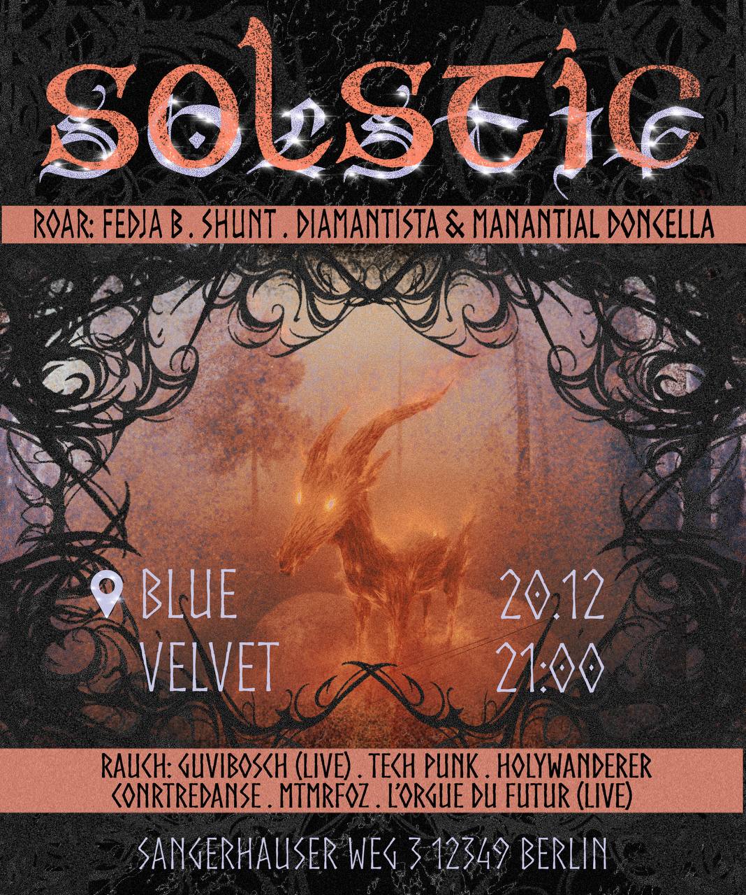 ✣⟁✣ A cold mist cuts through the forest air ✣⟁✣⟐⟊⟐ Faint lights shimmer between the trees, forming a circle ⟐⟊⟐✧⟟✧ Smoke drifting upward, a distant pulse rising from beyond the horizon — a promise of a night woven from ritual ✧⟟✧ ⟁✺⟁ Once again, we — Dust’n’Roar, together with Raucherlokal — turn our faces toward the winter sun just before it sinks into the longest night of the year ⟁✺⟁ ✴︎⟁✴︎ December - 20, live performances will guide us into a ritual state: ✴︎⟁✴︎ ⧖ Fedja B.⧖ SHUNT⧖ manantial_doncella & Diamantista ✦⟐✦ And, as always, rites of night enchanters: ⧃ GUVIBOSCH (live)⧃ L’orgue Du Futur (live)⧃ tech_punk (vinyl)⧃ mtmrfoz⧃ holywanderer⧃ contredanse ☿⟁☿ The entire procession will unfold at BLUE VELVET —a place chosen by the spirits of the forest themselves.They do not reveal their secrets to everyone, so the path must be taken ☿⟁☿ ✧⧖✧ Start: 21:00 ✧⧖✧ ☌⟊☌ All proceeds will go toward humanitarian aid for victims of armed conflicts ☌⟊☌