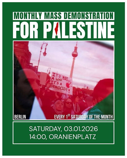 Take the streets. Join the resistance against the Zionist entity and German complicity! EVERY 1ST SATURDAY OF THE MONTH // We call for everyone to join protests and demand that justice is served, that Palestine is liberated from colonial oppression and occupation, and that those responsible for the death and destruction are hold accountable. Free Palestine is not a slogan. It is a call to dismantle colonialism and Zionism. It is a demand for the right of return. It is a promise that we will not rest until Palestine is free — from the river to the sea.