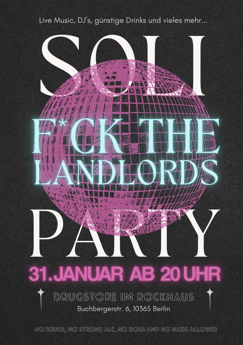 Let's celebrate getting through the darkest month together with a fun party evening in drugstore (rockhouse) 🪩🕺 This will be an amazing party with live band and multiple exciting djs ~ while also showing solidarity against the rising rent prices here in Berlin. Help us to collect money to fight against our landlord in Q216 Lichtenberg. F*ck them all, we need no landlords. For a good living for everyone! 💪