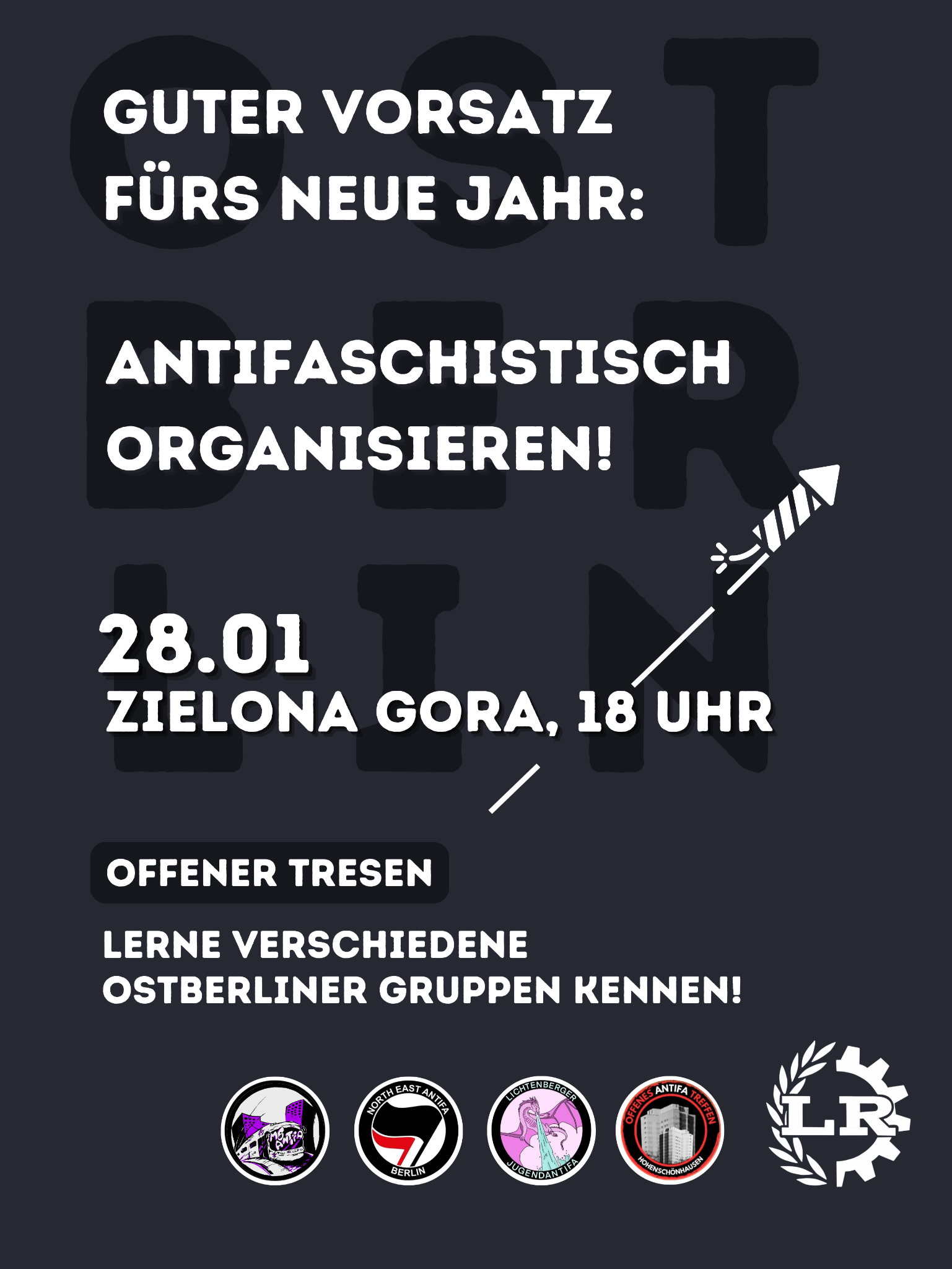 Guter Vorsatz fürs neue Jahr: Antifaschistisch Organisieren! Ihr wollt euch in Ostberlin engagieren? Am 28.01 stellen sich verschiedene Gruppen vor - Es gibt Pizza & Punsch, wir freuen uns auf euch!