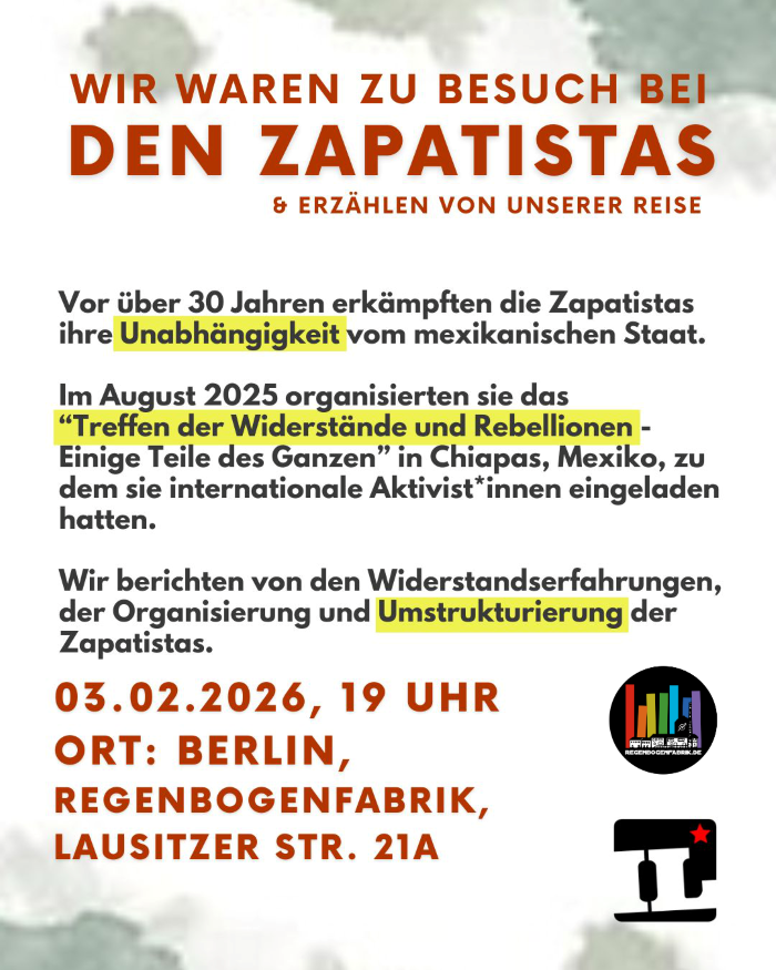 Im August 2025 organisierten sie das „Treffen der Widerstände und Rebellionen – Einige Teile des Ganzen“ in Chiapas (Mexico), zu dem sie internationale Aktivist*innen eingeladen hatten.