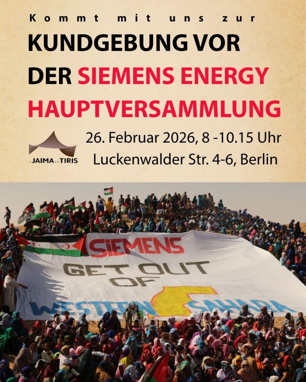 Kommt mit uns zur Kundgebung vor der Siemens Energy Hauptversammlung! Wir von La Jaima de Tiris schließen uns dem Protest vor Siemens Energy an. Unsere Forderung: STOP GREENWASHING THE OCCUPATION OF WESTERN SAHARA!
