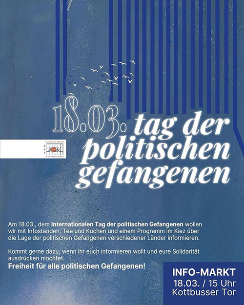 Am 18.03., dem internationalen Tag der politischen Gefangenen wollen wir mit Infoständen, Tee, Kuchen und einem Programm im Kiez über die Lage der politischen Gefangenen verschiedener Länder informieren.